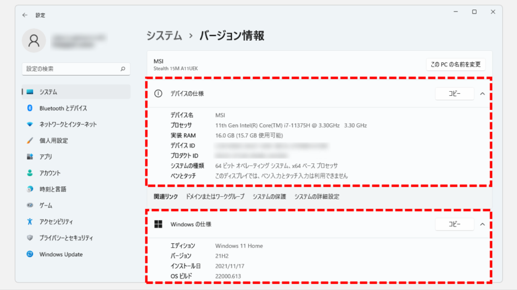 その中の「デバイスの仕様」欄にパソコンのスペック(性能)が記載されています。